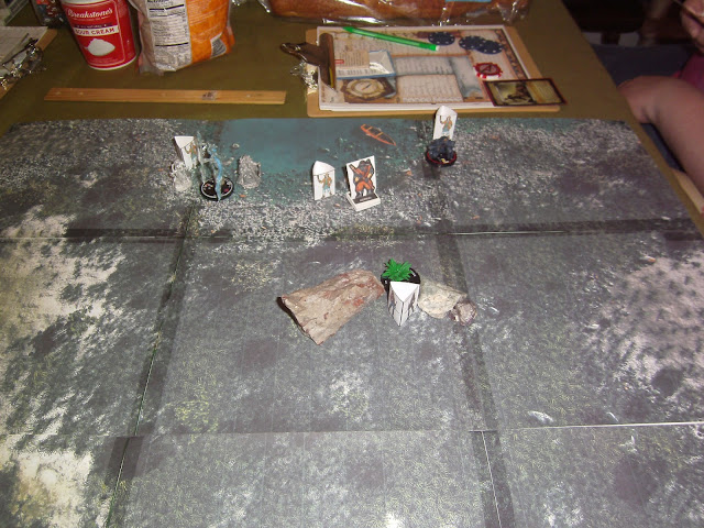 Tri-folds used are from the 50 Fathoms Figure Flat Pack PDF and a metal 50 Fathoms miniature by Pinnacle Entertainment Group. Heroclix by WizKids are used for some figures. The figure flat for Unk is from Deadly Missions Mercenaries by Grey Matter Games. Stun tokens also from Deadly Missions. DramaScape's Fantasy Creatures Paper Miniatures tree figure flats were used for the Slap Trees in Scene 2.