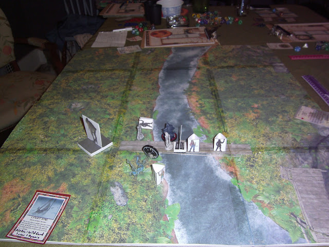 Tri-folds used are from the 50 Fathoms Figure Flat Pack PDF and a metal 50 Fathoms miniature by Pinnacle Entertainment Group. Heroclix by WizKids are used for some figures. The figure flat for Unk is from Deadly Missions Mercenaries by Grey Matter Games. Stun tokens and Abu also from Deadly Missions. DramaScape's Lost World Miniatures were used for the Tyrex in Scene 2.